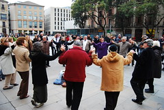 The Sardanadancers join together with holding hands and raising arms, forming circles that grows more and more, as more people join in. When the circle grows too big, more circles are formed. A leader is followed, who leads the movement. People from all walks of life and in all ages join in to the dance, to show that they are primarily catalans and united in this dance. The dance is said to be a symbol of catalan unity and pride.